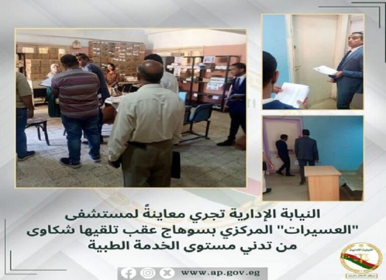 تنفيذًا لتكليفات معالي المستشار عبد الراضي صِدِّيق – رئيس هيئة النيابة الإدارية حيال تكثيف جهود مكافحة الفساد المالي والإداري، وتفعيلاً للتعليمات الخاصة بالاهتمام بشكاوى المواطنين المتعلقة بعمل الجهاز الإداري للدولة ومرافقها، وحال تلقي النيابة الإدارية بالمنشأة بمحافظة سوهاج شكوى مفادها “تردي مستوى الخدمات الطبية بمستشفى “العسيرات” المركزي”؛ قام السيد المستشار الدكتور/ خالد هاشم – مدير النيابة بتكليف فريق من أعضاء النيابة بالانتقال للمستشفى وإجراء المعاينة على الطبيعة للوقوف على مدى صحة ما جاء بالشكوى، حيث انتقل كل من السيد الأستاذ/ محمد هشبول علي – رئيس النيابة، والسيد الأستاذ/ محمود جمال الضبع – رئيس النيابة، يصاحبهما مدير التفتيش المالي والإداري بالوحدة المحلية بالمنشأة، لمقر المستشفى.