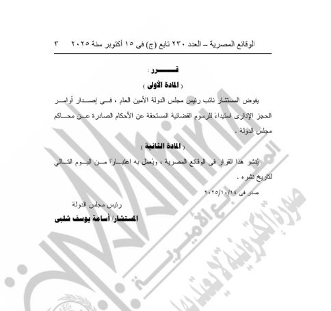نشرت الجريدة الرسمية، قرار المستشار أسامة يوسف شلبي، رئيس مجلس الدولة، رقم ٨٣٥ لسنة ٢٠٢٥، بتفويض نائب رئيس مجلس الدولة الأمين العام في إصدار أوامر الحجز الإداري لاستيداء الرسوم القضائية المستحقة عن الأحكام الصادرة من محاكم مجلس الدولة.