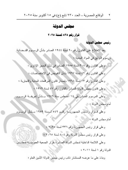 وجاء في القرار أنه صدر بعد الاطلاع على عدد من القوانين المنظمة، من بينها قانون الرسوم القضائية ورسوم التوثيق في المواد المدنية، وقانون الحجز الإداري، وقانون المرافعات المدنية والتجارية، وقانون مجلس الدولة، والقرارات الجمهورية المنظمة لرسوم التقاضي أمام المجلس.