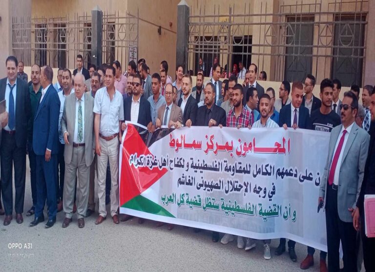 أكد رضا الطحاوى نقيب محامي سمالوط بالمنيا، أن نقابة المحامين نظمت اليوم، وقفة تضامنية للأشقاء الفلسطينيين أمام محكمة سمالوط، بحضور المئات من المحامين، واستمرت الوقفة ساعة كاملة.
