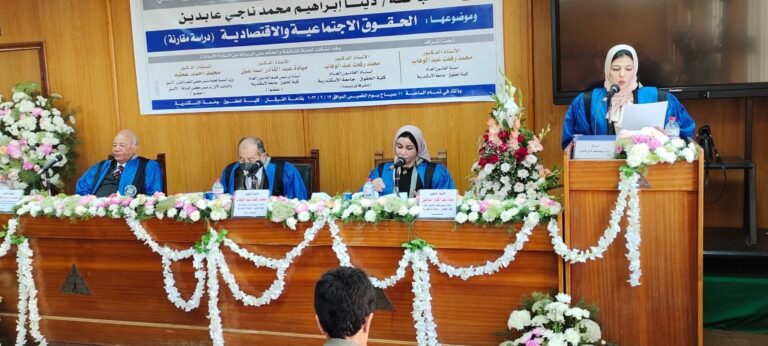 تمت يوم الخميس الموافق ١٧/ ٣/ ٢٠٢٢ مناقشة الرسالة العلنية المقدمة من مدرس مساعد/ دينا إبراهيم محمد ناجي عابدين نجلة الرحوم المستشار ابراهيم عابدين نائب رئيس هيئة النيابة الادارية وعضو المكتب الفني بالاسكندرية لنيل شهادة الدكتوراة في القانون بقاعة الأستاذ الدكتور/ جلال العدوي بمركز الأسكندرية للتحكيم و الخدمات القانونية و الإقتصادية بكلية الحقوق جامعة الإسكندرية بعنوان : الحقوق الإجتماعية و الإقتصادية (دراسة مقارنة)،