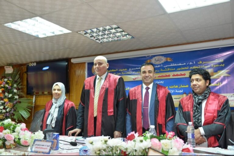 وتكونت لجنة الحكم والمناقشة من كلٍ من الاستاذ الدكتور محمد ابراهيم علي موسى استاذ ورئيس قسم القانون التجاري وعميد كلية الحقوق جامعة طنطا سابقاً مشرفاً ورئيساً، والاستاذة الدكتورة حنان عبد العزيز مخلوف استاذ ورئيس قسم القانون التجاري بكلية الحقوق جامعه بنها عضواً، والاستاذ الدكتور حسام رضا السيد استاذ ورئيس قسم القانون التجاري بكلية حقوق جامعه عين شمس عضواً