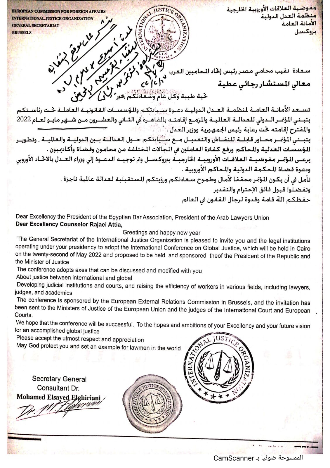 تلقى الأستاذ رجائي عطية نقيب المحامين ـ رئيس اتحاد المحامين العرب ـ دعوة من الأمانة العامة لمنظمة العدل الدولية، لتبنى المؤتمر الدولي للعدالة العالمية، والمزمع اقامته بالقاهرة في الثاني والعشرون من شهر مايو لعام 2022، والمقترح اقامته تحت رعاية رئيس الجمهورية ووزير العدل.