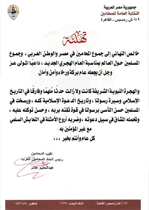 خالص التهاني إلى جموع المحامين في مصر والوطن العربي، وجموع المسلمين حول العالم بمناسبة العام الهجري الجديد،