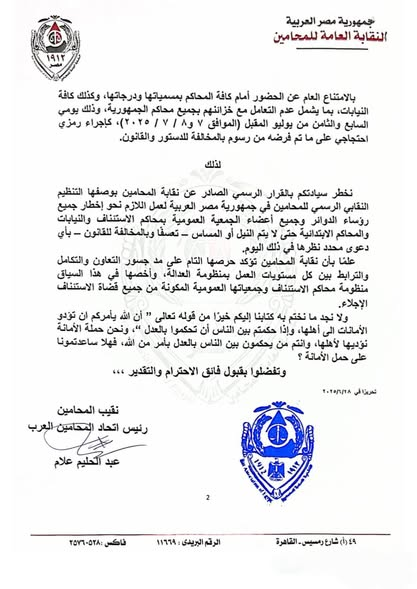 نُخطر سيادتكم بالقرار الرسمي الصادر عن نقابة المحامين، بوصفها التنظيم النقابي الرسمي للمحامين في جمهورية مصر العربية،